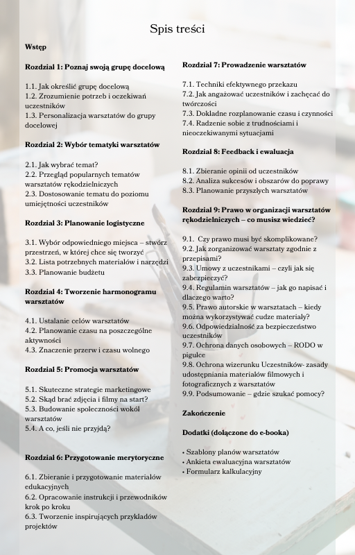 Chcesz zorganizować warsztaty rękodzielnicze, które będą dopięte na ostatni guzik – od pomysłu, przez promocję, aż po kwestie prawne? Ten e-book to kompleksowy przewodnik dla twórców, którzy chcą prowadzić swoje zajęcia profesjonalnie, bez stresu i ryzyka.
